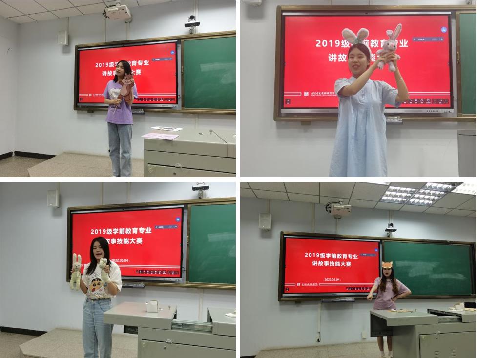 为进一步提高学生的专业技能,丰富课余生活,新葡8883官网AMG官网于2022年5月4日晚举行2019级学前教育专业讲故事技能大赛。因疫情影响,大赛采用线上、线下相结合的方式,以班级为单位,分别在南实验楼416、412、214及215教室同时进行。