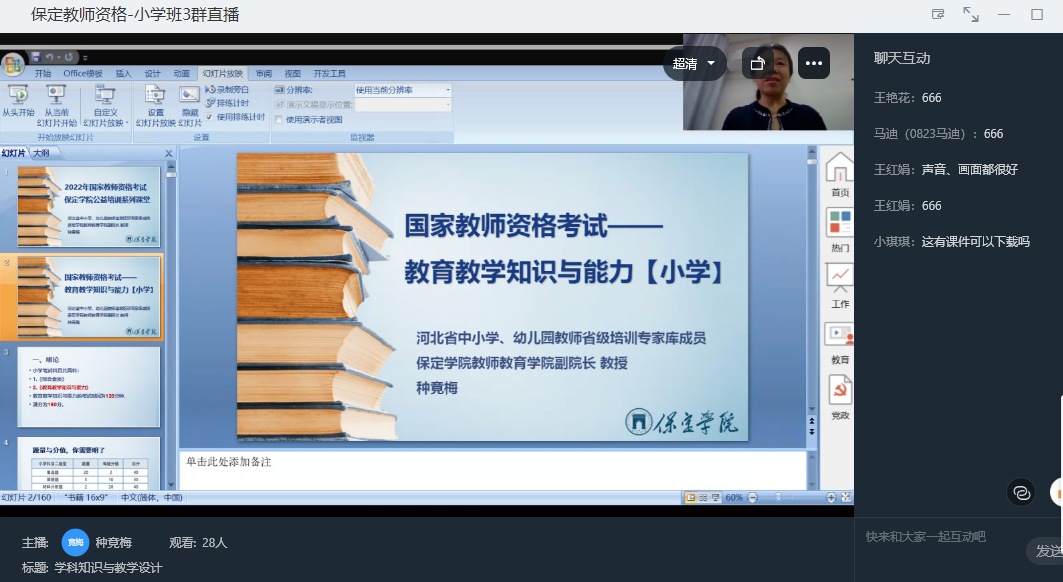 培训分为中学、小学、幼儿园等三个学段,内容包括《教育知识与能力》《教育教学知识与能力》《保教知识与能力》和《综合素质》,共计48课时。培训采取线上直播授课形式进行,特设视频讲座回看功能,方便无法按时收看直播的学员学习和复看。此次培训吸引了社会人员、在校大学生共7712人报名参训,同步在线听课人数达55846人,累计点赞37万次,单场讲座最高点赞量13万次。