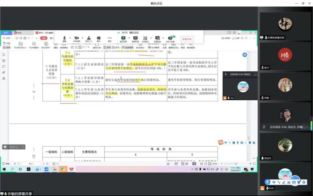 为顺利完成小学教育省级一流专业验收重点工作,古诗词考级体系建设以及毕业论文指导等基本工作,2022年9月21日下午3点30分,通过腾讯会议平台召开了小学教育专业本学期第四次教学研讨会议,参加本次会议的人员有新葡8883官网AMG官网院长王全乐,副院长种竟梅以及小学教育教研室全体教师。在近三个小时的研讨会议中,议题主要有三项,分别为小学教育专业省级一流专业的验收工作研讨、古诗词考级体系的建设以及对2019级学生论文指导工作做出安排。