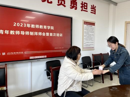 一杯拜师茶,一生师徒情,在学院领导的见证下,青年教师张倩、李叶一一向导师鞠躬拜师,敬茶致礼。