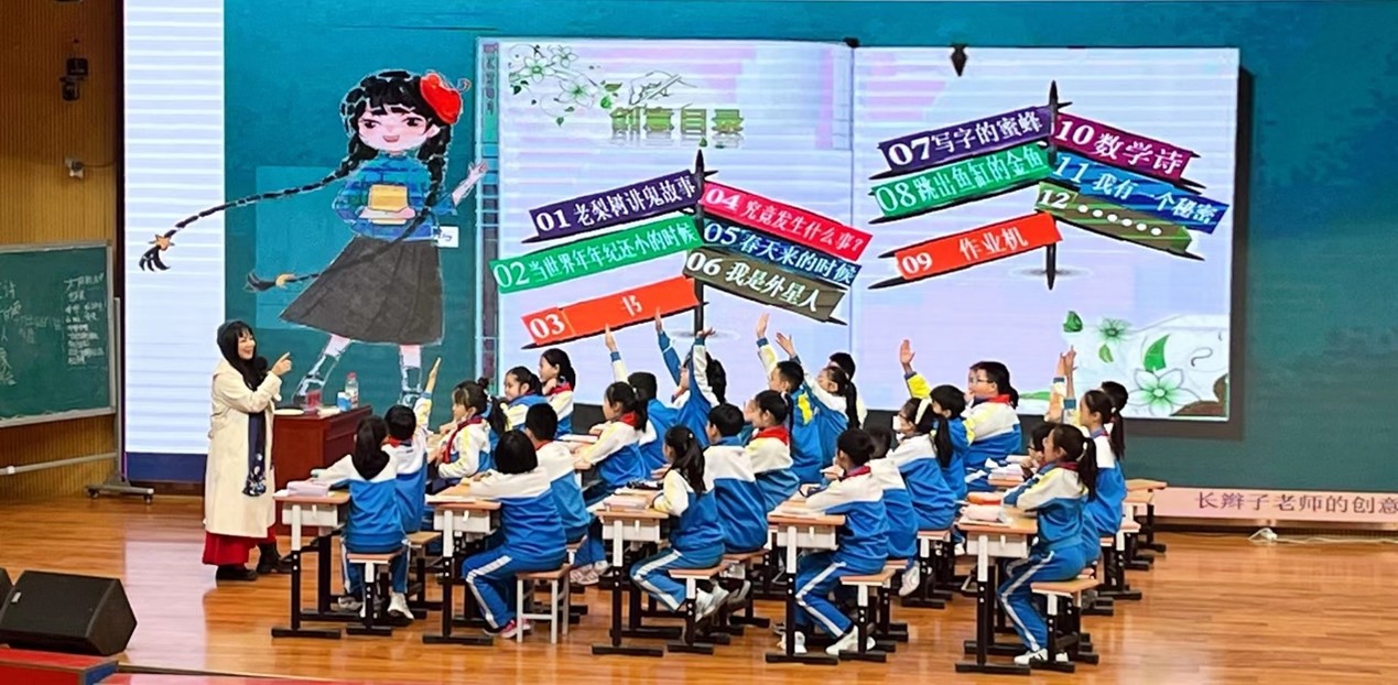 首先,师生观摩了郭学萍执教的《轻叩诗歌的大门》课例。课堂开始,郭老师以礼物为由,借助四个苹果,带领孩子进入诗歌的世界,运用“五觉法”引导小学生自主创造儿童诗,在郭老师的帮扶下,一首集体创作的小诗完成了,小学生的作诗热情高涨。接着,郭老师介绍自己的诗集,让小学生知道诗集包括封面、目录、正文和封底。在交流诗集时,她让学生自主选择喜欢的诗,谈内心的感受,并介绍诗的类型(抒情诗、图画诗、数字诗、荒诞诗……),小学生在诵读和交流的过程中,变身“小老师”,学着老师的样子,自主分享感受。最后,她教会了学生如何高效使用诗集册,并以诗歌结尾。在整堂课的学习活动中,学生们体会到了诗歌是有趣的、富有想象力的、富有创意的。