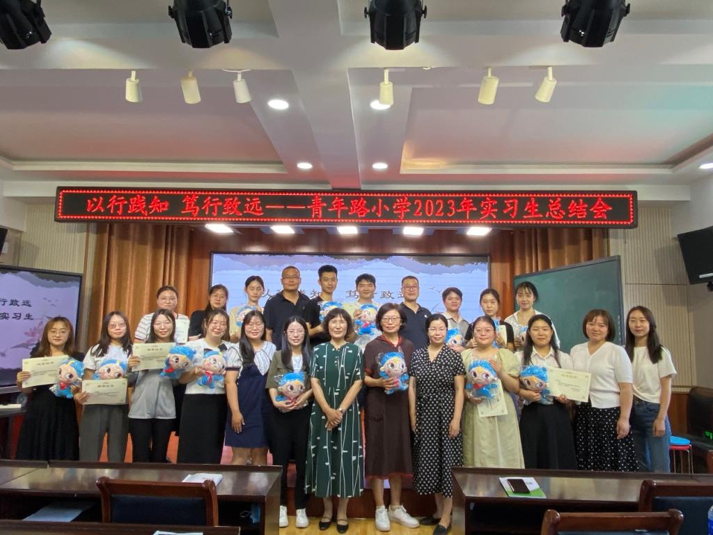 其次,基地指导教师对实习生工作进行了评价。基地指导教师们肯定了实习生扎实的基本功和踏实的工作态度,并为同学们的成长感到骄傲,感谢同学们为青年路小学的付出,希望同学们在未来能够继续保持“踏实”、“扎实”、“充实”、“厚实”的态度遇到最美好的自己;表示青年路小学永远是同学们的家,是同学们战斗过的岗位,14位实习生永远是青小的一员。青年路小学领导和指导教师为14位实习生颁发荣誉证书及纪念品,将仪式教育的美好再次种植在学生心中,师生合影留念。