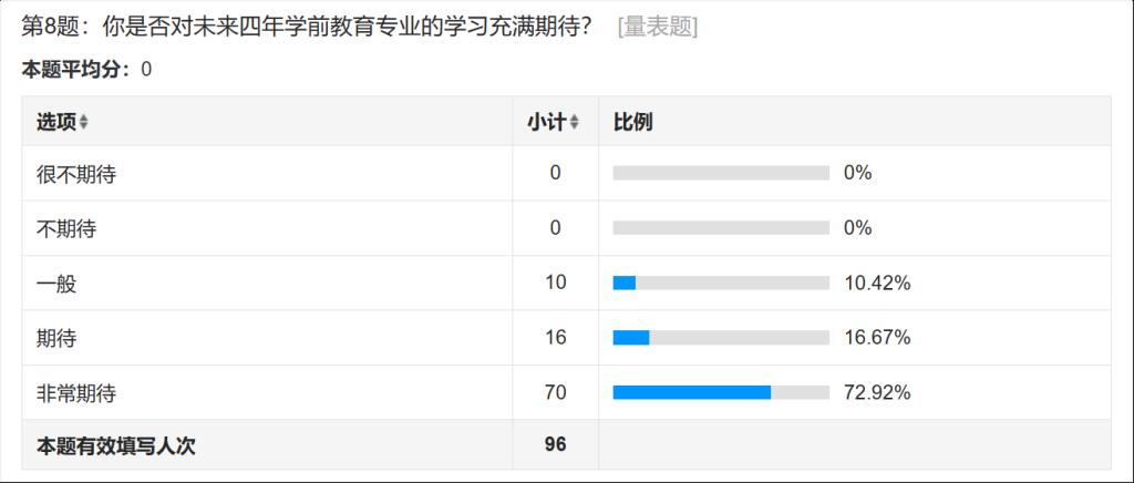 根据问卷结果了解到,本届学前新生对未来的专业学习充满期待。这一环节增进了我们对新生的了解,有助于学生发展规划意识的建立。