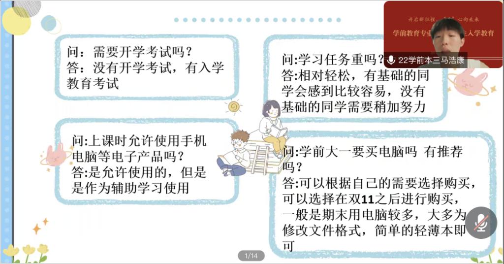 此次会议中,学前专业安排了不同角色师生,结合前期调研活动中新生关于入学、大学生活、专业学习等方面问题进行相应视角下的分享。