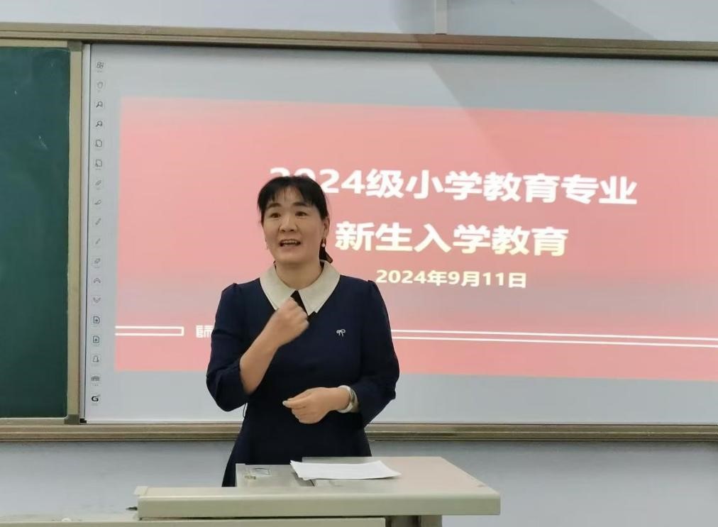 然后,教师代表赵红芳教授以自身从教经历为切入点,充分阐述了教书育人的重要性,并寄语新生,希望同学们能尽快成为高素质的小学教师,牢记自己的担当,与祖国同向,与时代同行。