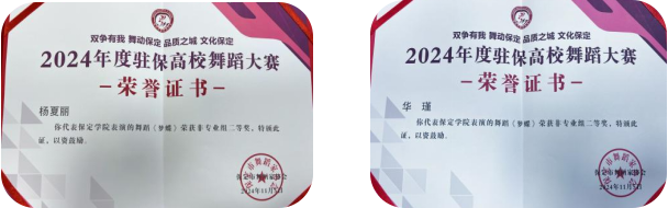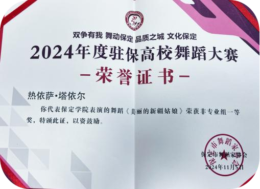热烈祝贺新葡8883官网AMG官网在2024驻保高校舞蹈大赛中取得优异成绩!其中冯华老师指导的群舞《大漠之花》获得非专业组特等奖、独舞《美丽的新疆姑娘》获得非专业组一等奖、独舞《欢乐地跳吧》以及双人舞《梦蝶》获得非专业组二等奖;杨爽老师指导的独舞《灵》获得一等奖!