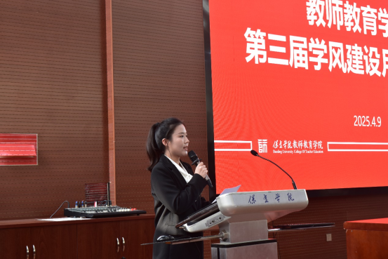 学生会副主席张星怡代表院学生会向全体同学发出倡议,号召同学们珍惜学习时光,勤奋刻苦,勇于探索,遵守学校规章制度,以实际行动践行教育家精神、 涵育优良学风,共同为班级和学院的荣誉而努力。