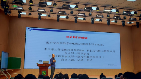 随后,李老师开展了“AI时代下水文教学功能转换与写作要求”的专题讲座。李老师结合自身多次写“下水文”的经历和学生实际,论证了语文教师写下水文的重要性与要求,强调写作是教师与学生心与心的交流,并建议大家下水文写作务必真实,一定要引导学生表达真实想法。