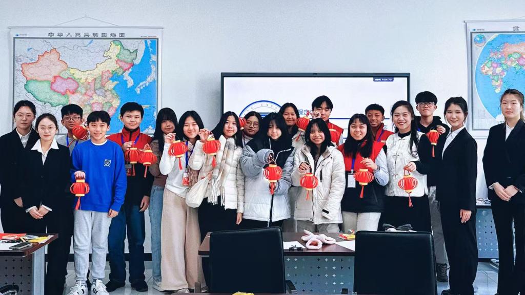 朱红纸韵映笑颜,盏盏灯笼藏温情。中外学子或互赠美好祝福,或探讨粘贴技巧,摇曳的灯笼与笑语交织,让冬日教室溢满传统古韵。当最后一盏灯笼在指尖成型,学子们举着灯笼合影留念,彩纸与流苏在镜头里相映成趣。