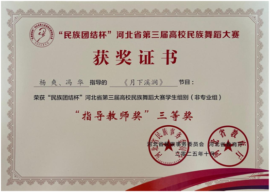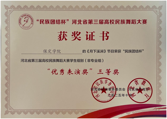 2025年10月,由河北省民族事务委员会、河北省教育厅共同主办的“民族团结杯”河北省第三届高校民族舞蹈大赛落下帷幕。本次大赛吸引了全省66所高校参加,共征集380部舞蹈作品,其中学生组别(非专业组)178个。经评委评审,最终确定非专业组70个参赛作品进入现场展演评奖阶段。