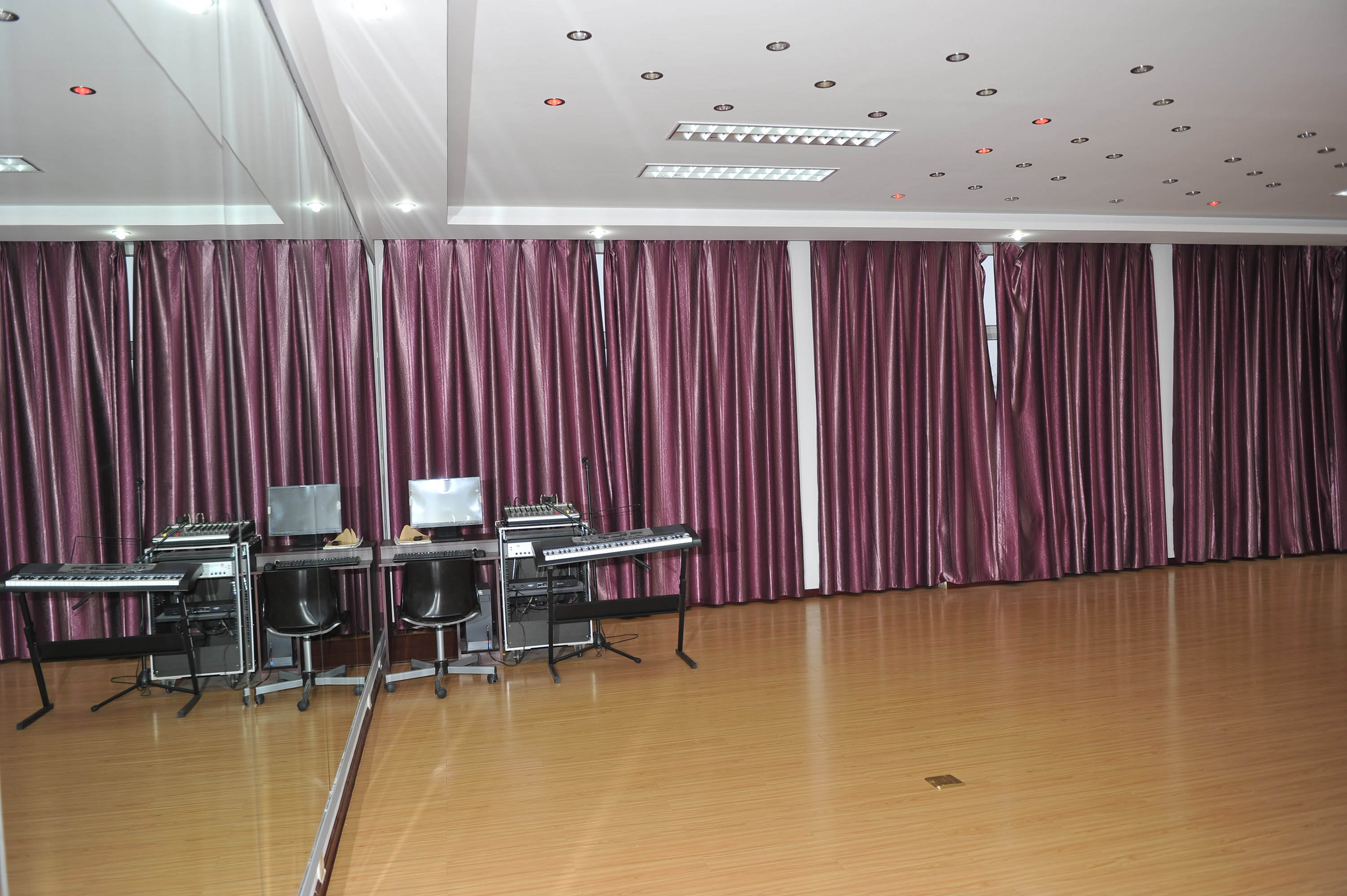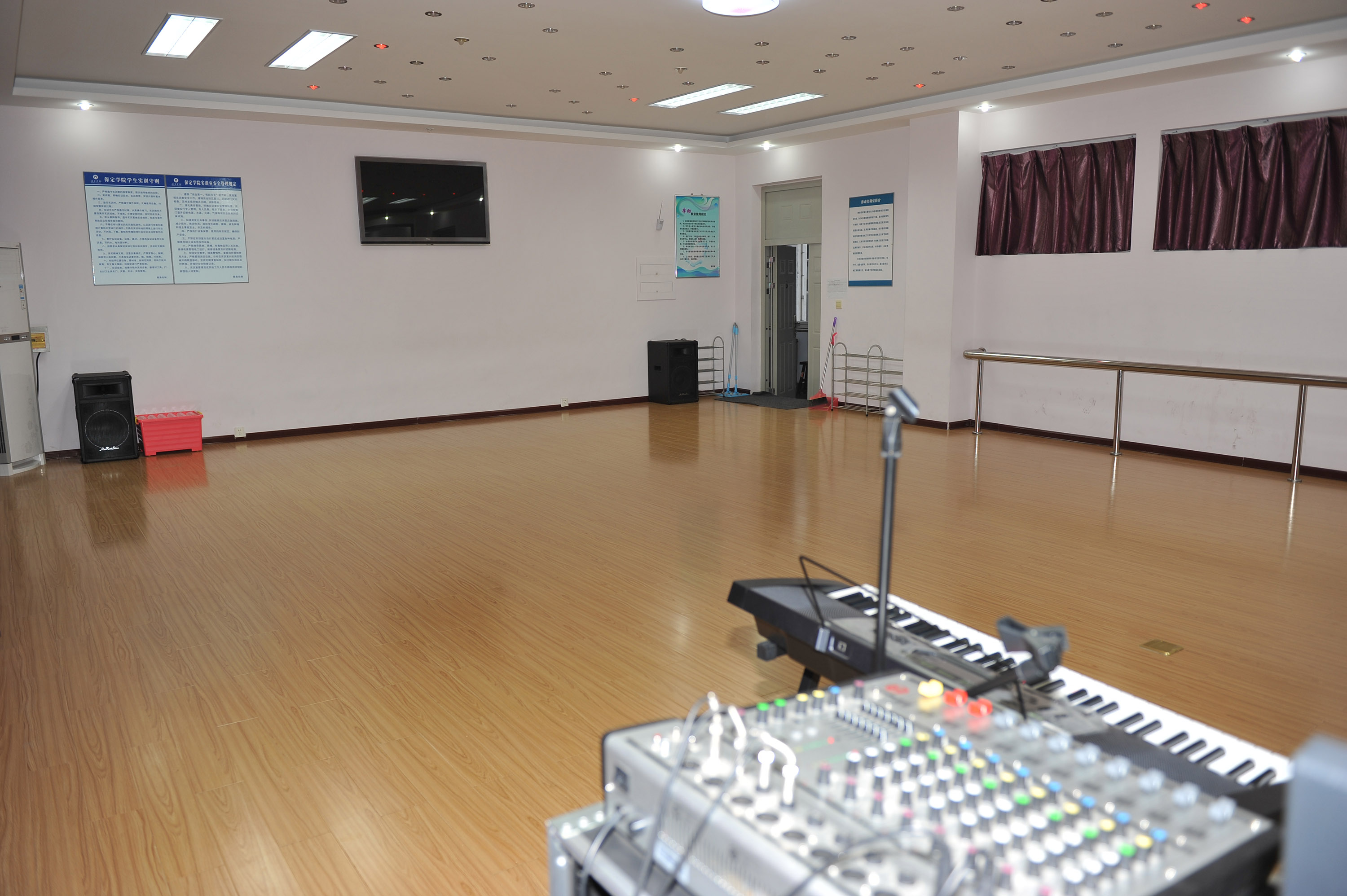 该实训教室是目前华北地区规模最大的,设备最齐全的律动实训室。室内铺设弹性木地板,地板下安装踢踏传感器,采用面振式激励源,把乐器的演奏通过地板的振动或灯光的变化给聋哑儿以有节奏的韵律感,从而实现在教师指导下聋哑儿能进行体操及舞蹈动作,并达到动作优美、体形健美、反应灵敏的授课效果。