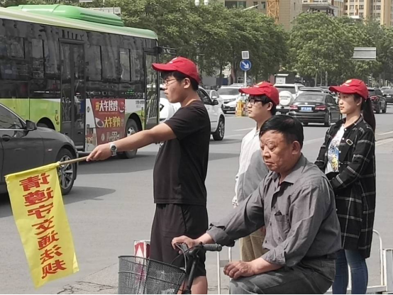 在指挥交通活动开展期间,每周六、日下午,在东风桥、小蜜蜂两个路口及火车站、保百大楼、七一路一带,都能看到我们志愿者的身影,在志愿服务活动中,志愿者们头戴志愿服务帽子,手执文明交通指挥旗,面带笑容,主动热情,认真履行职责,积极引导行人遵守交通规则。