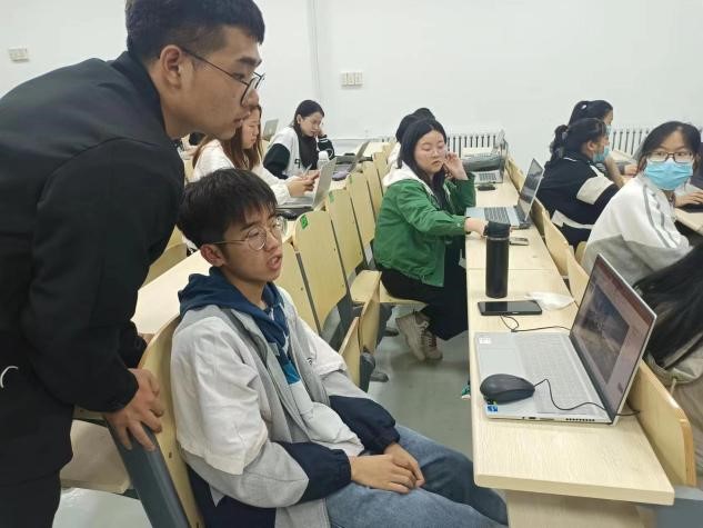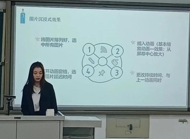 第三期培训人员为张佳瑞、于其力格尔和武鑫蕊三位同学,培训内容为图片沉浸式播放转场效果、转场特效、进度条动画。讲解员于其力格尔为大家进行了步骤讲解和演示,生动有趣的动画演示让同学们高呼精彩,同学们都认真听讲、积极提问。