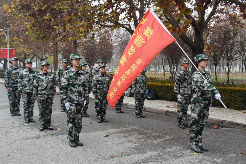 在庄严的音乐声中,旗手护卫着军旗走来,全体师生起立合唱《中国人民解放军军歌》。队列表演在师生嘹亮的歌声后开始,4个方阵,300多名2022级新生身着迷彩绿接受检阅,响亮的口号声和整齐划一的动作展示出新葡官网学子蓬勃向上的精神面貌。
