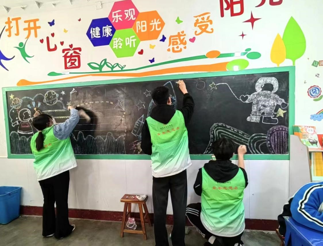 志愿者们还帮助低年级班级画板报丰富班级文化,在办公室帮助老师批改作业。志愿者们秉承志愿服务理念,传承青春活力气息,孩子们纯真开朗,如同朝阳一般,给人光明与快乐。最后,大家顺利完成了服务任务,虽然劳累,但仍不改大家完成志愿活动后的喜悦与满足。